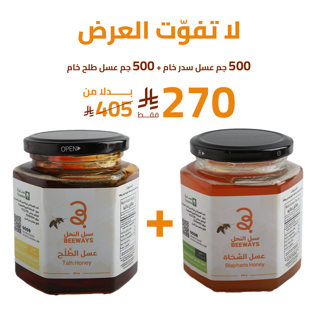 تسوّق الآن واحصل على عروض عسل السدر والطلح الخام، طبيعي 100٪، غني بالمواد التي يحتاجها جسمك يوميًا، اطلبه الآن واحصل على بكج النخبة (عسل سدر+عسل طلح) بجودة عالية وطعم لا يُقاوم.